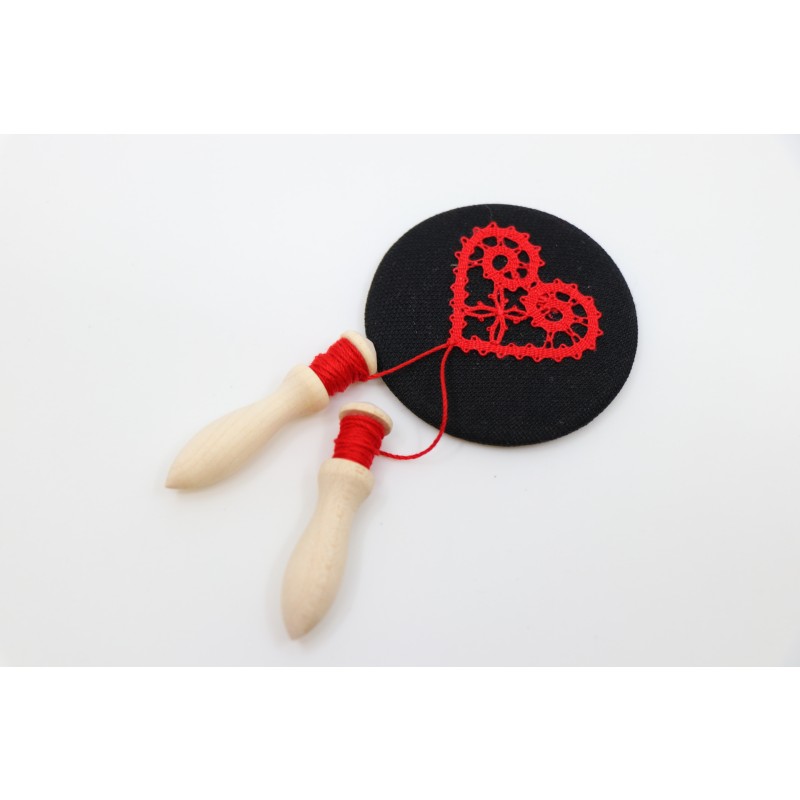 Magnetek z ročno klekljano čipko v obliki srčka ter parom klekljev - izdelava Lidija Mal Anzelm